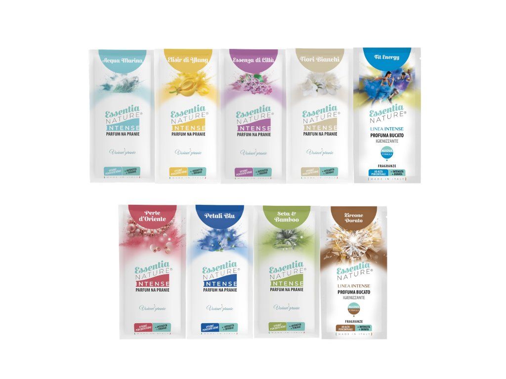 Zkušební sada vzorků olejových parfémů na praní Essentia řad INTENSE -9 x 20 ml.